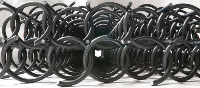 These spiral lengths are then interwoven and laced with straight steel rods to form a rigid mattress